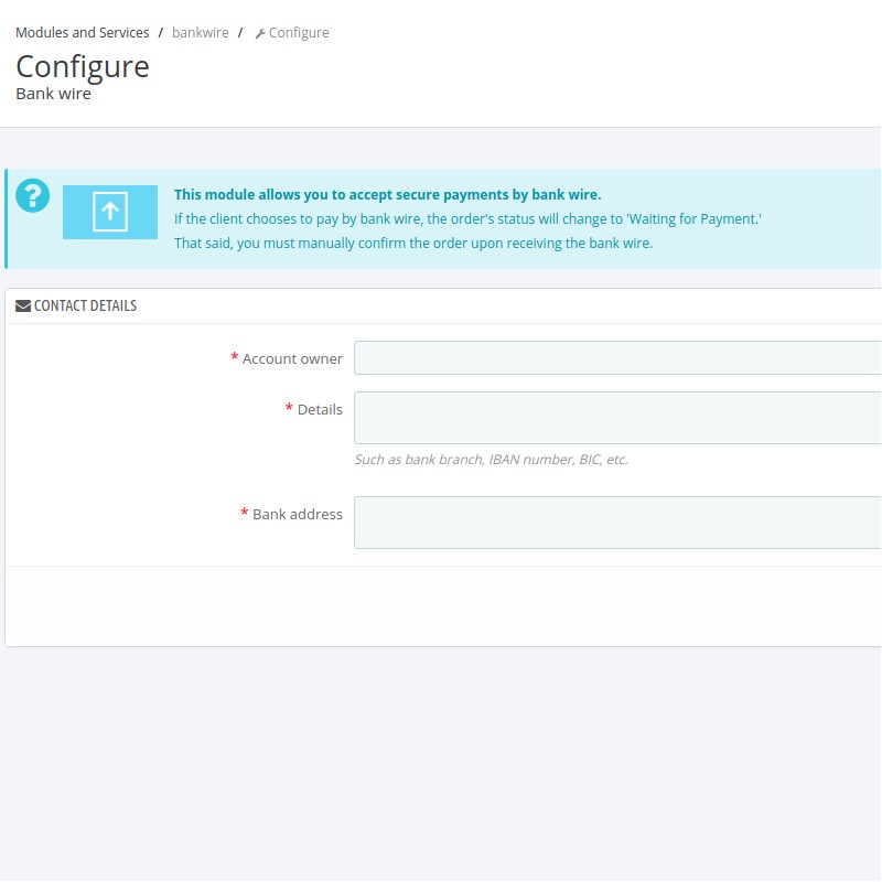 With the thirty bees bank wire module you can easily accept bank wire transactions for your customers. This module creates the order and displays the bank wire information to your customers on checkout, so they can use their bank to pay for your goods or services.